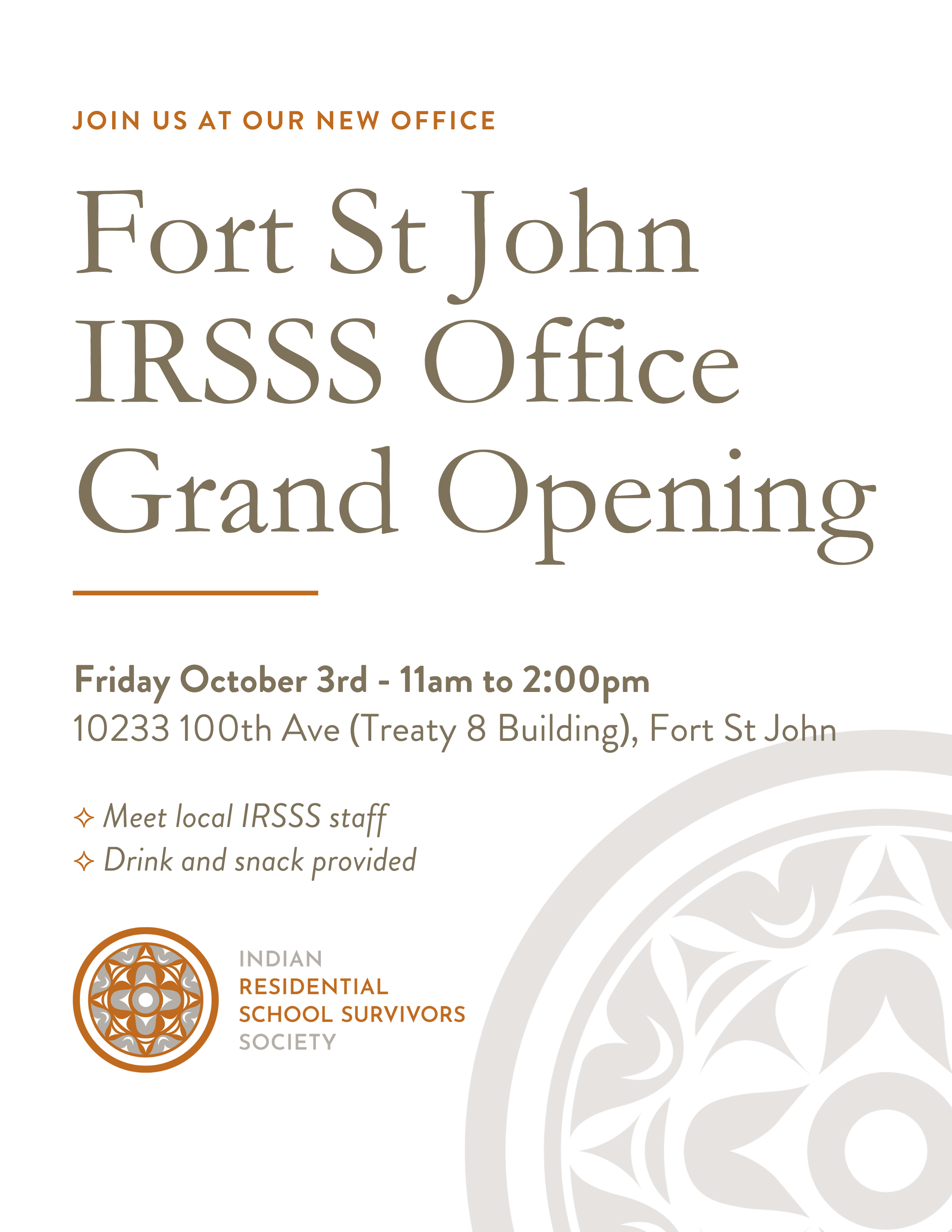 Join us in Fort St John BC on October 3rd, 2025 to celebrate the grand opening of the newest IRSSS office location.